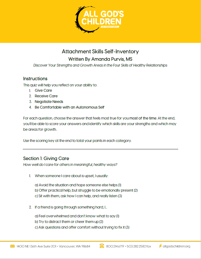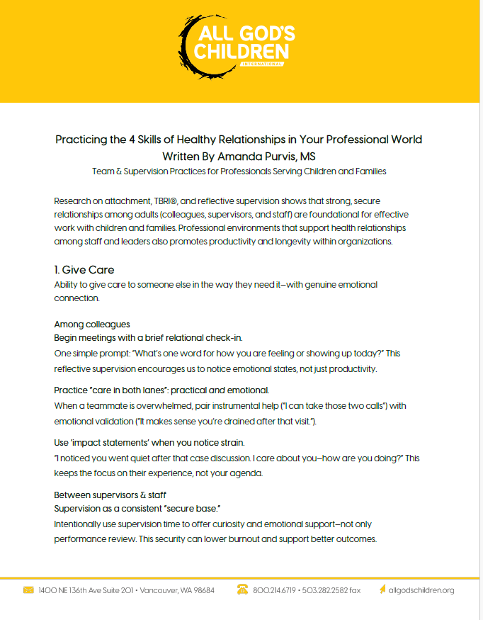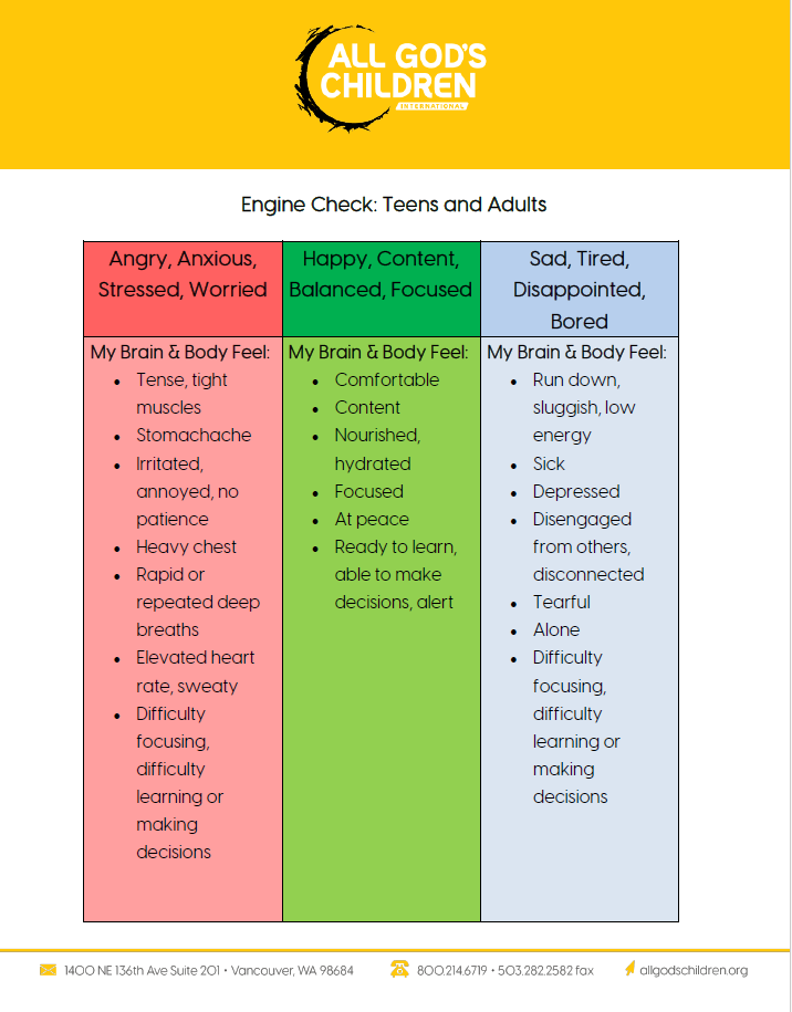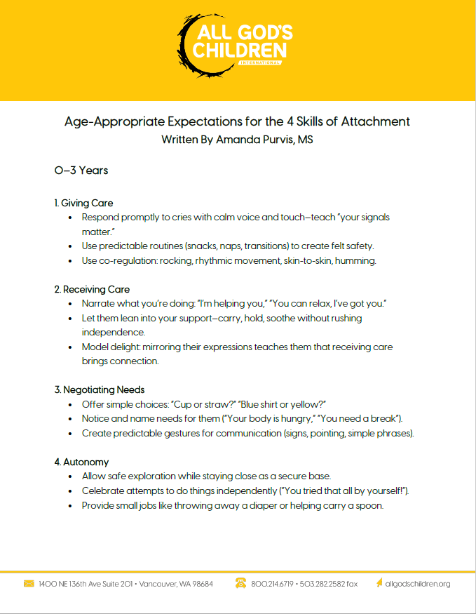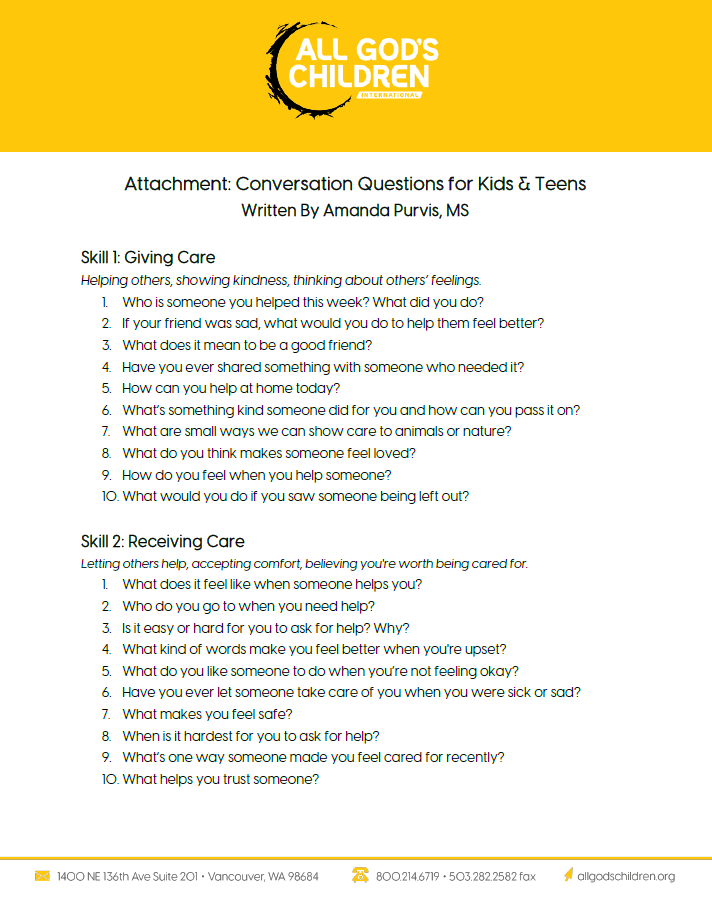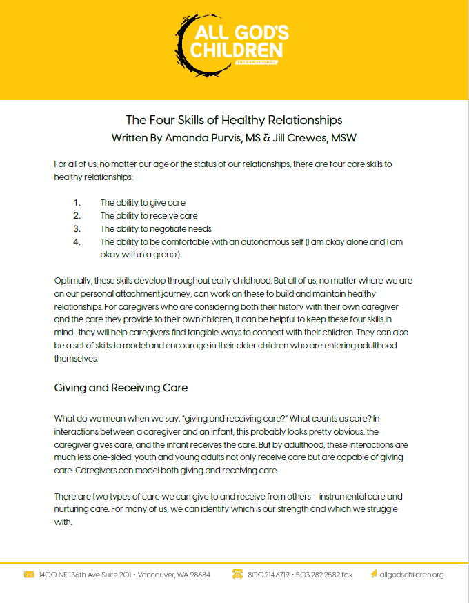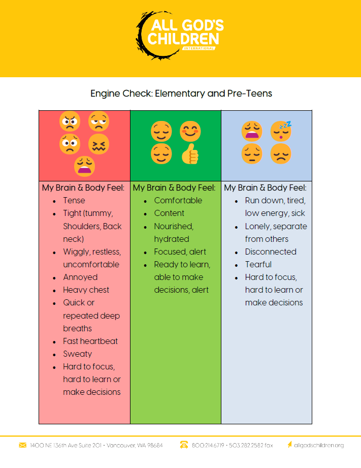 Resources for Healing Engine Check: Elementary and Pre-Teen Engine Check: Elementary and Pre-Teen Age-Appropriate Expectations for the 4 Skills of Attachment Physiological Strategies and Regulation Age-Appropriate Expectations for a Child’s Ability to Self-Regulate Tips for Caregivers: Noticing Your Own Regulation State The Four Skills of Healthy Relationships Healthy Relationships in your Professional World Attachment Skills Self-Inventory Attachment: Conversation Questions for Kids & Teens